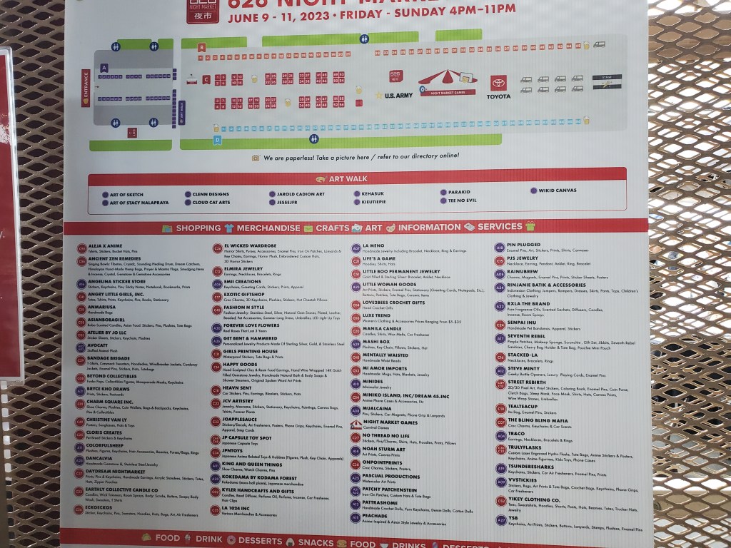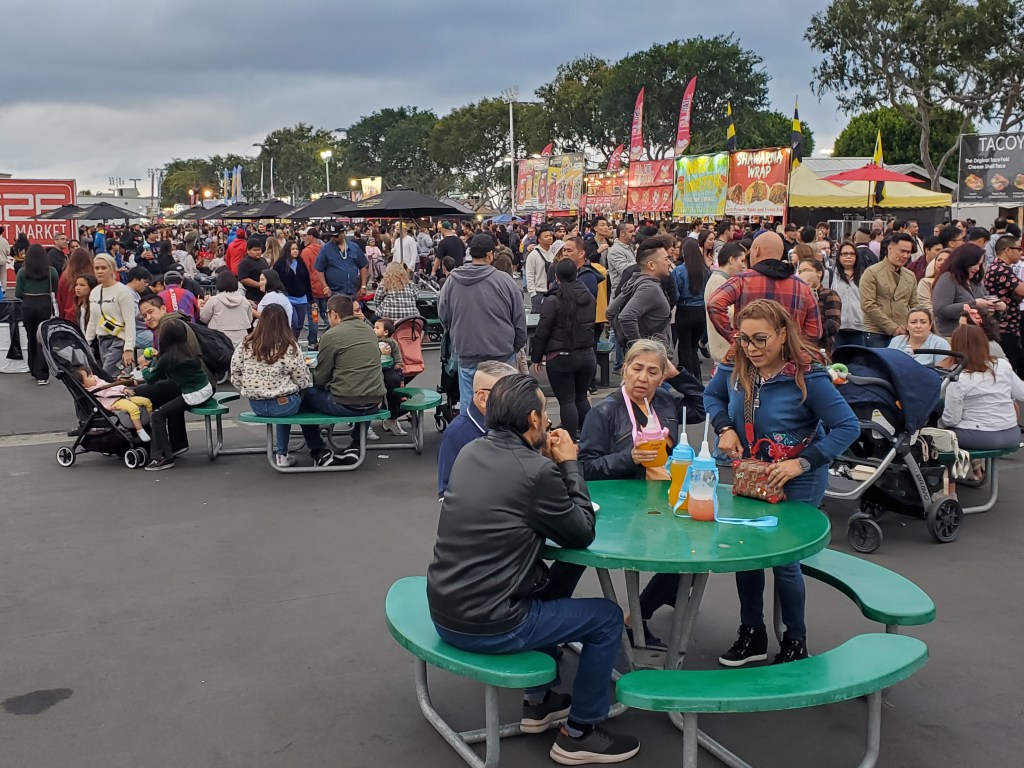 626 Night Market is very well known in OC and LA and is always mobbed. Plan to be leaving the grounds by 7 to avoid the worst crowds; we arrived at 5. You will jockey a bit for table space. Seating is on the left side only. Plenty of bathrooms inside plus a facility outside before you enter.