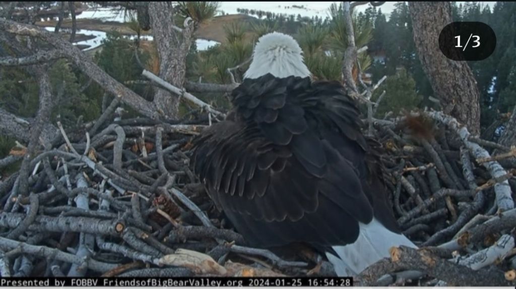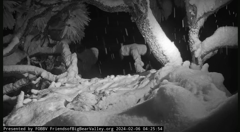 After Sunday and Monday’s 4-6″ of rain in LA basin, let’s check in on that Big Bear Bald Eagle nest. Can you see Jackie as she protects her biggest brood ever (3 eggs!) –