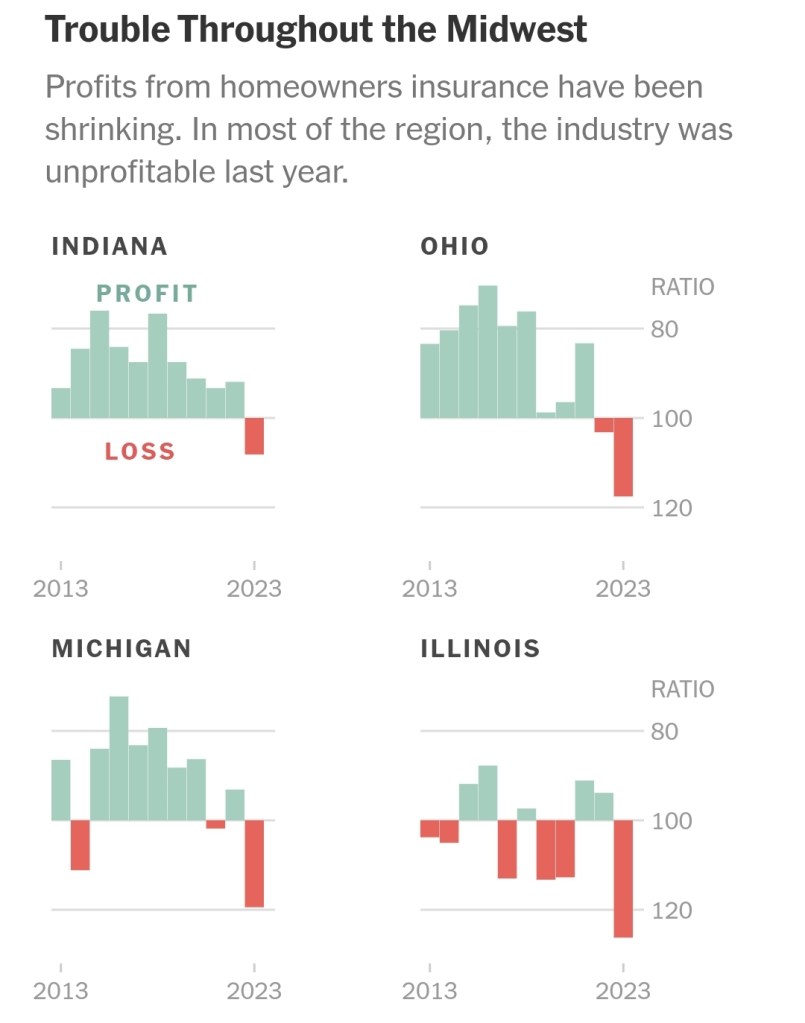 “Pekin says it has “paused” writing homeowners insurance in Illinois, Indiana, Ohio and Wisconsin, citing the increased frequency and severity of storms. Secura is dropping customers in Illinois, Indiana and Michigan.