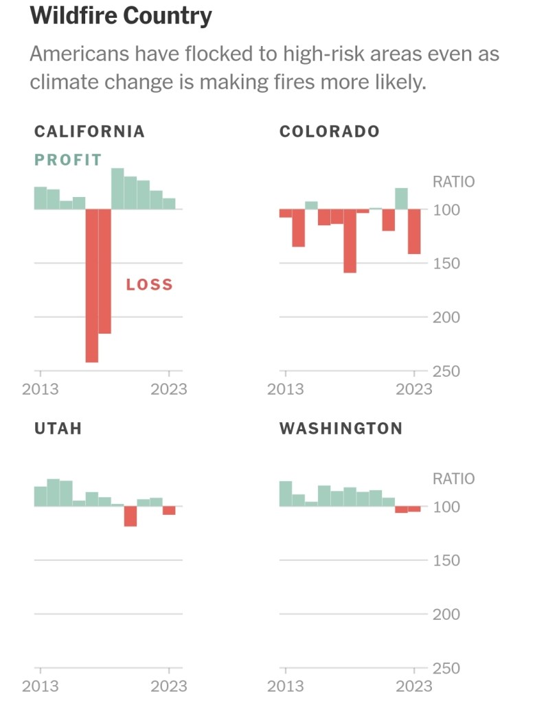“In 2023, insurers lost money on homeowners coverage in 18 states, more than a third of the country, according to a New York Times analysis of newly available financial data. That’s up from 12 states five years ago, and eight states in 2013. The result is that insurance companies are raising premiums by as much as 50 percent or more, cutting back on coverage or leaving entire states altogether. Nationally, over the last decade, insurers paid out more in claims than they received in premiums, according to the ratings firm Moody’s, and those losses are increasing.”