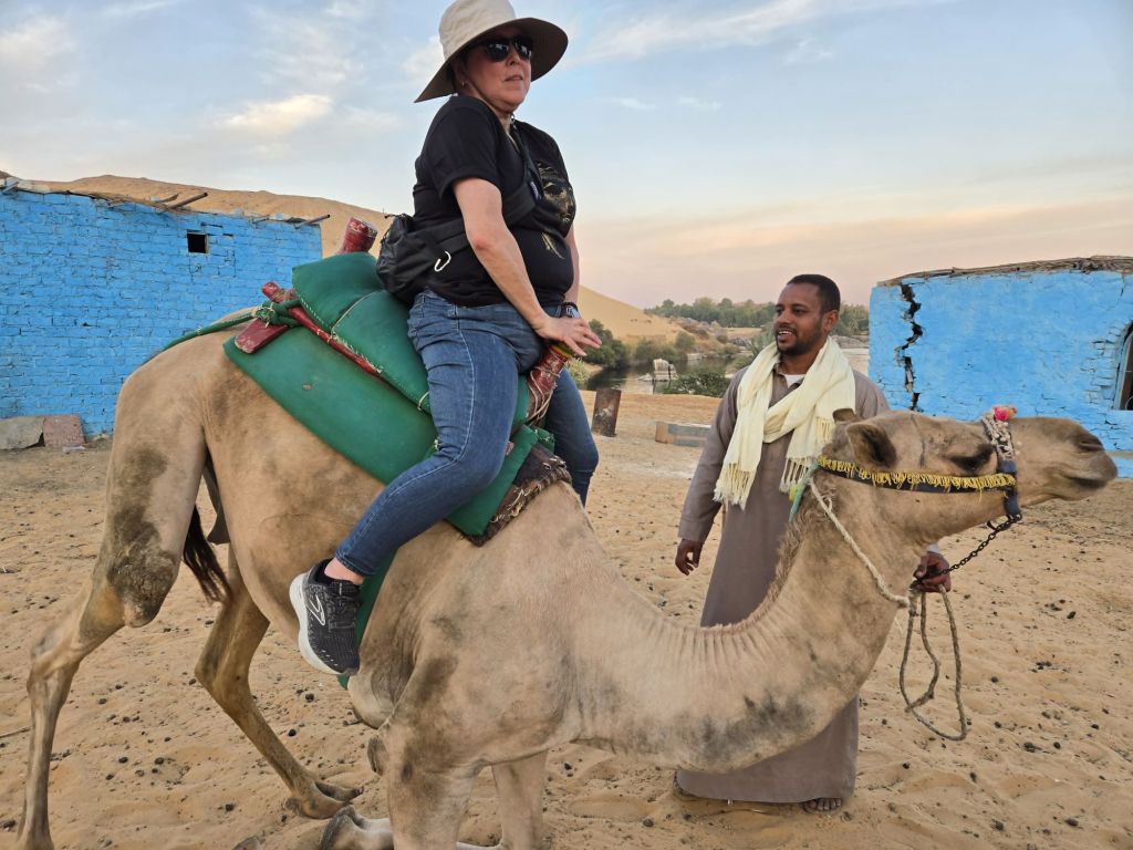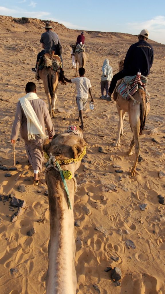As we turned to reach the top of the bluff overlooking the Nile, a young village man appeared over the ridge that we had just struggled to ascend on camelback, carrying a metal tray on which was balanced 5 glass mugs and a pot of tea, and in Adidas shower sandals. In fact I think he came up an even steeper trail. We paused to give the camels a rest although I was sure they could have gone on for many hours. I mean, we know whose hindquarters really needed a rest. (To sit, i believe the camels went down on their knees first then their hocks. Ouch. But easiest for the riders.)
