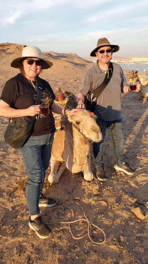 Our tour operator’s communication about excursions is pretty low-detail as compared to Viator, so imagine our surprise when we were falucca’d across the Nile to a small desert valley in Aswan where our four camels waited. The head camel tender appraised our weight at a glance, and from his ATV nodded me towards a large camel named King. Mr A got the young camel Casanova (1 year 3 mo old), pulled by a kid and an energetic young man (the one holding the tea tray in the picture). Looking at the pictures now, King and Casanova seem to be about the same size. Ms F’s camel was Oscar.