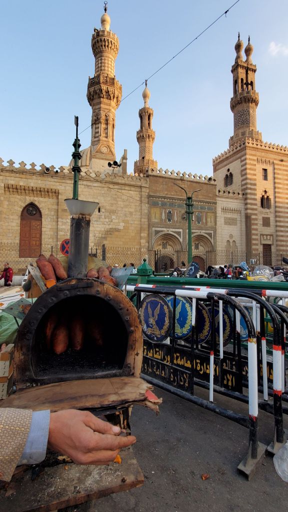 We reached the curb of Nafal Al Azhar and Mr A is explaining the mosque and the associated university. The sweet potato guy notices my stare and shows me the inside of his pitch black portable oven in which 6 sweet potatoes were baking. I take a photo.