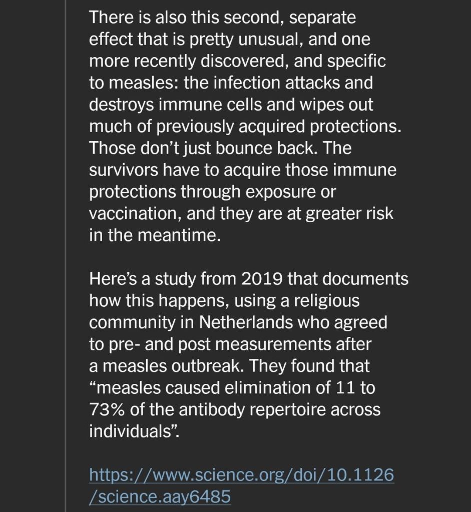 Why you don’t want it: Measles eliminates 11 to 72 pct of your antibody repertoire https://www.science.org/doi/10.1126/science.aay6485 Share this: Click to share on X (Opens in new window) X Click to share on Reddit (Opens in new window) Reddit Click to share on Facebook (Opens in new window) Facebook Like Loading... Related Comments are closed.