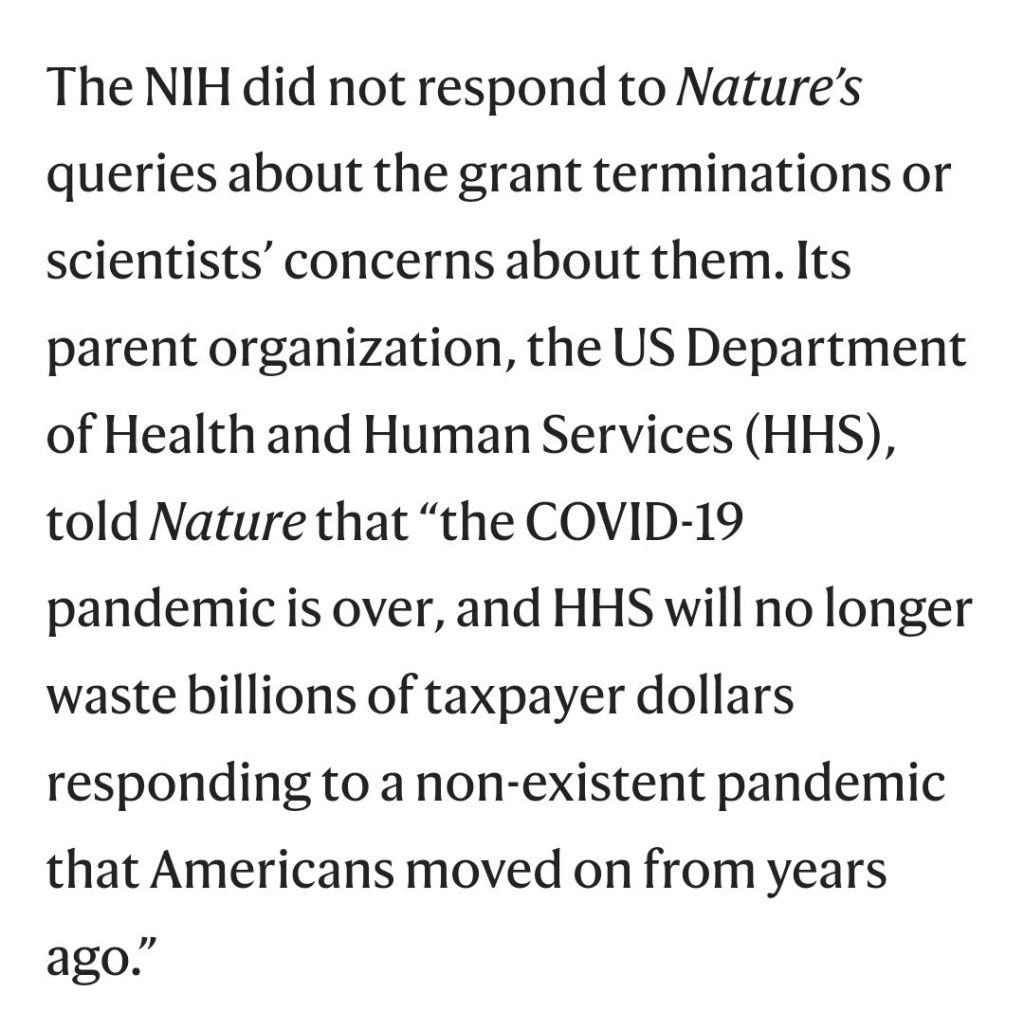 I am part of the NIH Long COVID “RECOVER” study. I just sent them an email a few weeks ago asking if Recover was in jeopardy – at the time they hadn’t heard anything – but I guess my premonition was correct.
