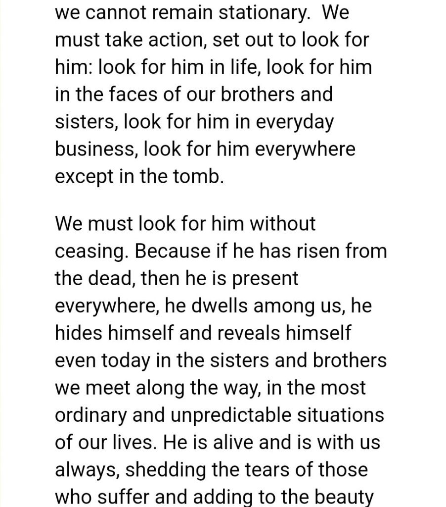 - I am not of the flock, but these are beautiful words from Pope Francis https://www.vatican.va/content/francesco/en/homilies/2025/documents/20250420-omelia-pasqua.html