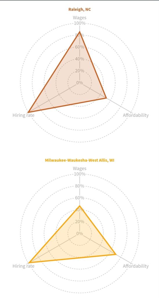 “In one of the toughest markets for entry-level jobs in years, several second-tier cities—including Raleigh, N.C.—rise above the pack for their strong hiring, decent salaries and affordability. Instead of Atlanta or Chicago, consider Birmingham, Ala., or Milwaukee. Or think Baltimore, in lieu of Washington, D.C.